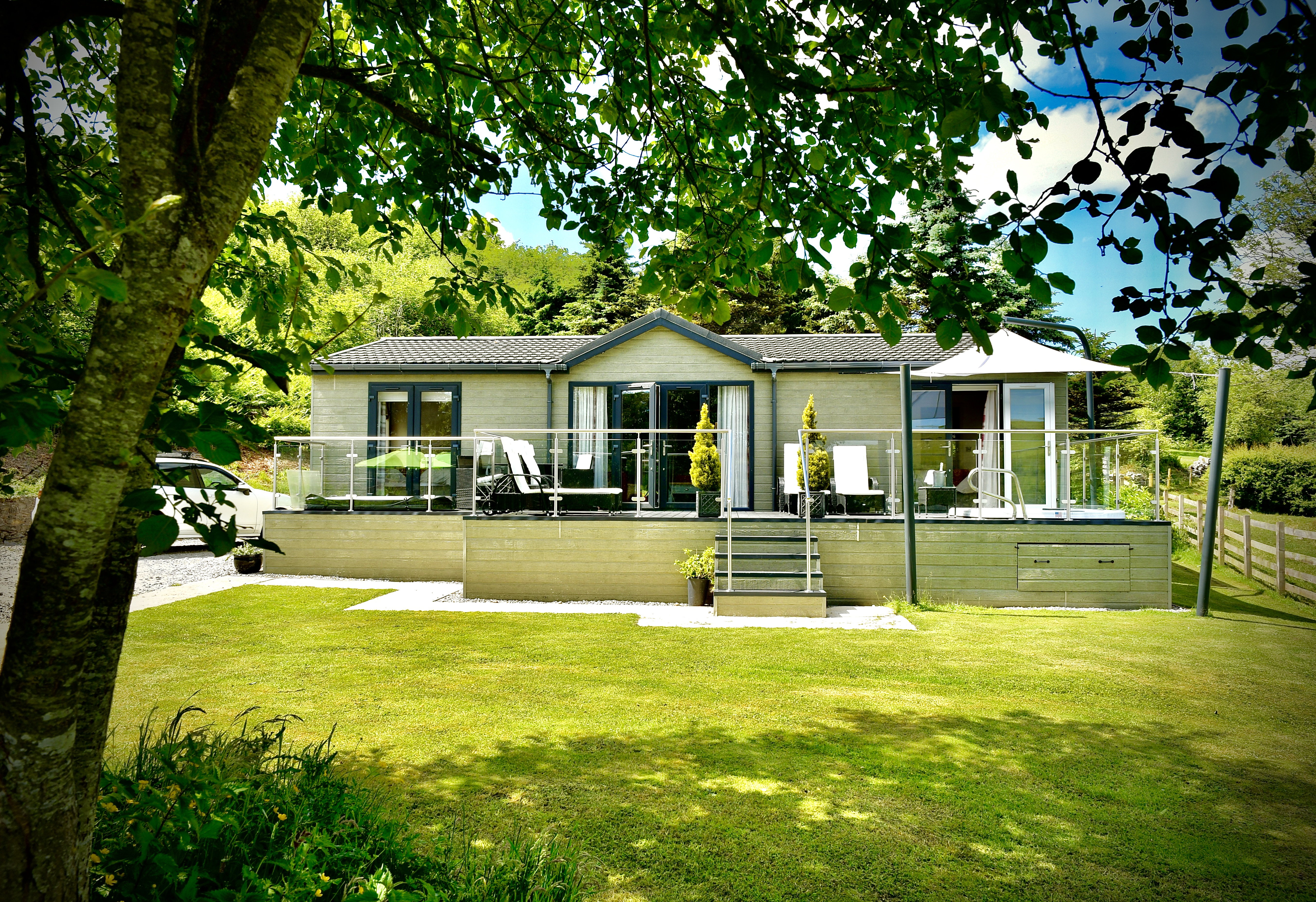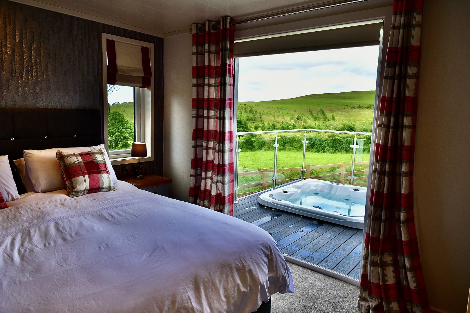 Luxurious hotel-standard accommodation, with all the charms of a cosy country hideaway. Each cabin has its own distinctive style and Ceri, with its warm reds and traditional tartan touches, has been elegantly designed with your comfort and relaxation in mind. For more information on each part of the cabin, click on the headers above. -